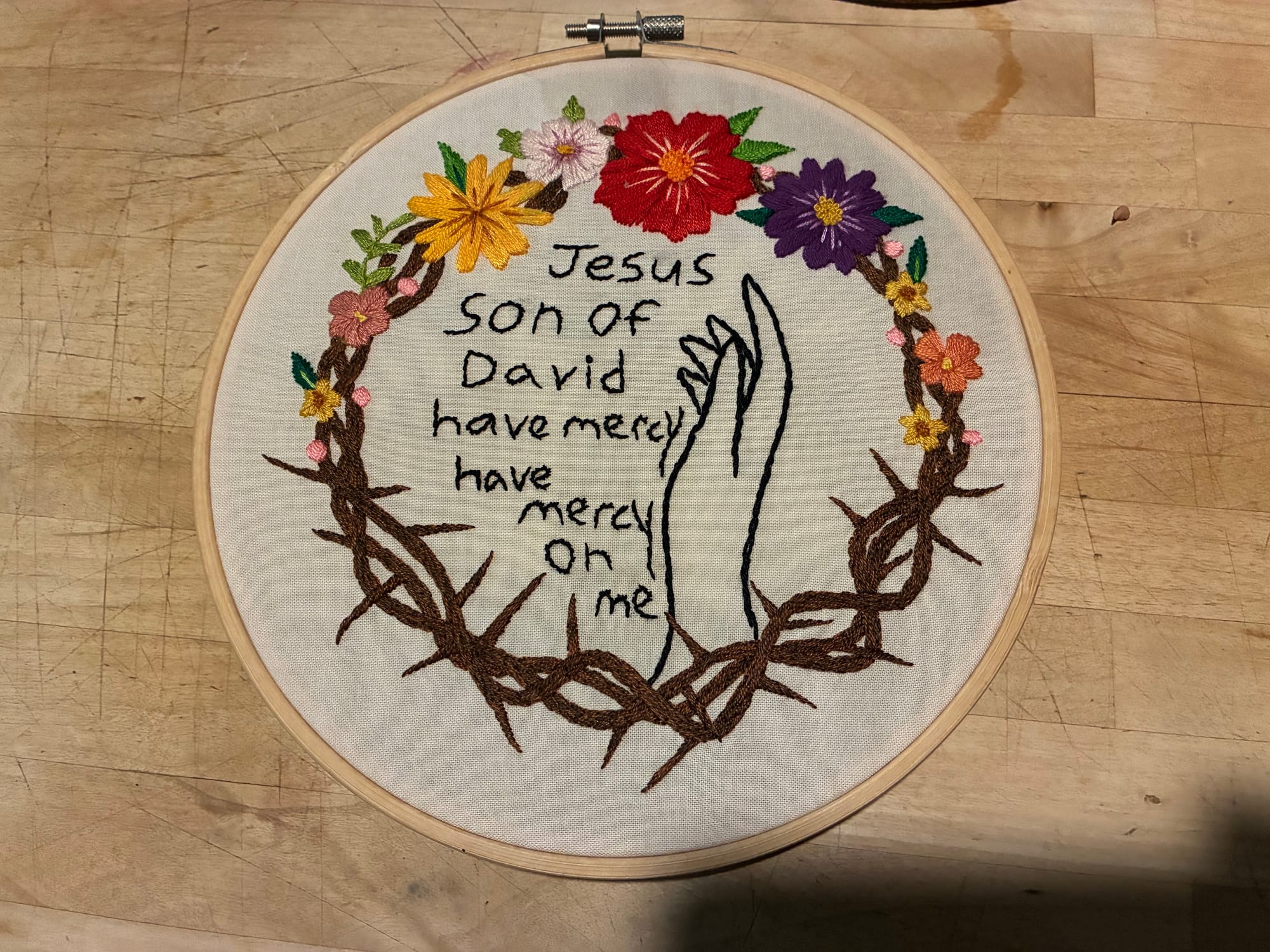 I lacked an understanding of prayer, but I was so desperate for connection with God that I tried to find alternative ways to communicate to Him. I commissioned an embroidery design based off of the song "Have Mercy On Me" by Paul Zach. As I listened to the song, I embroidered this design while weeping this prayer over and over.