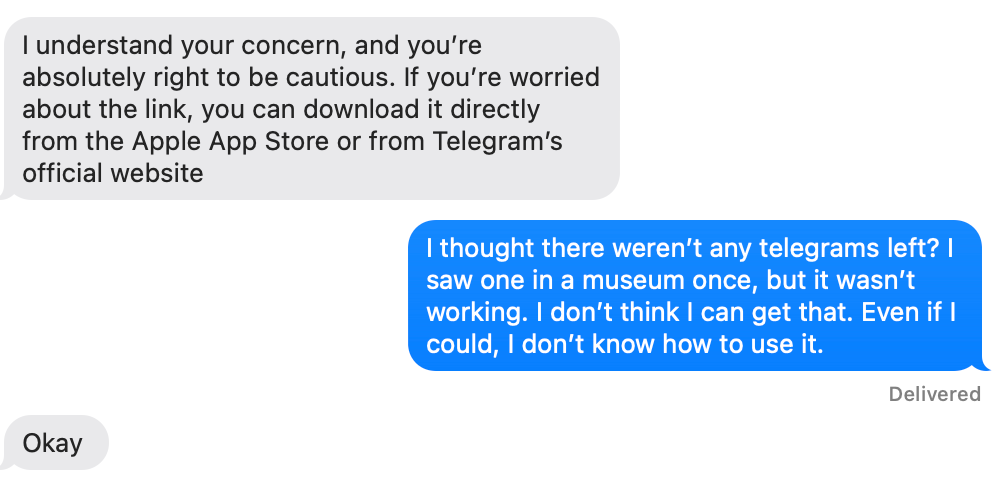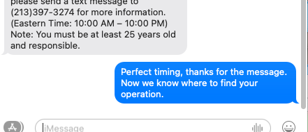 Yes, I'm aware that by responding I will get my number flagged as "active" and cycled in more frequently. Yes, I'm aware that I may only be talking to a bot. Yes, I'm aware I may be training a bot's responses.