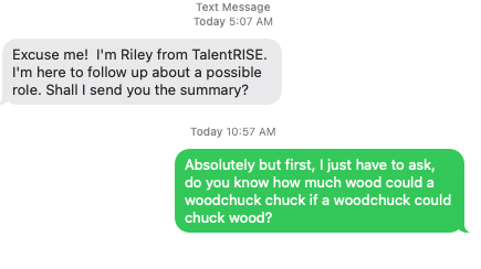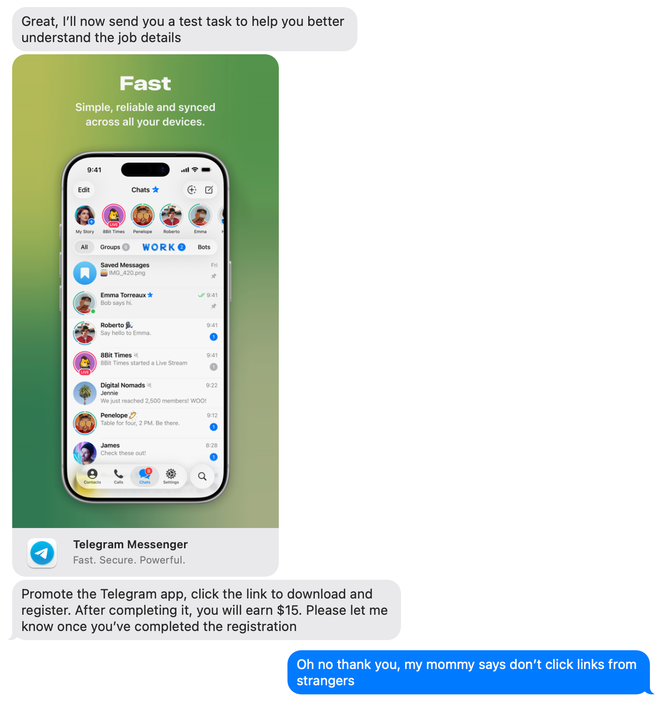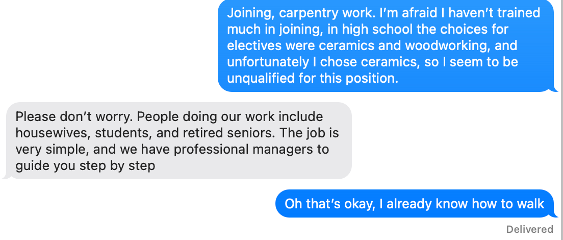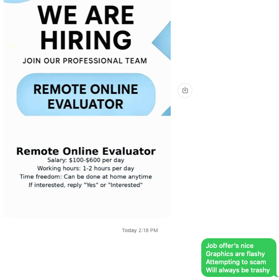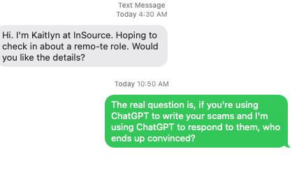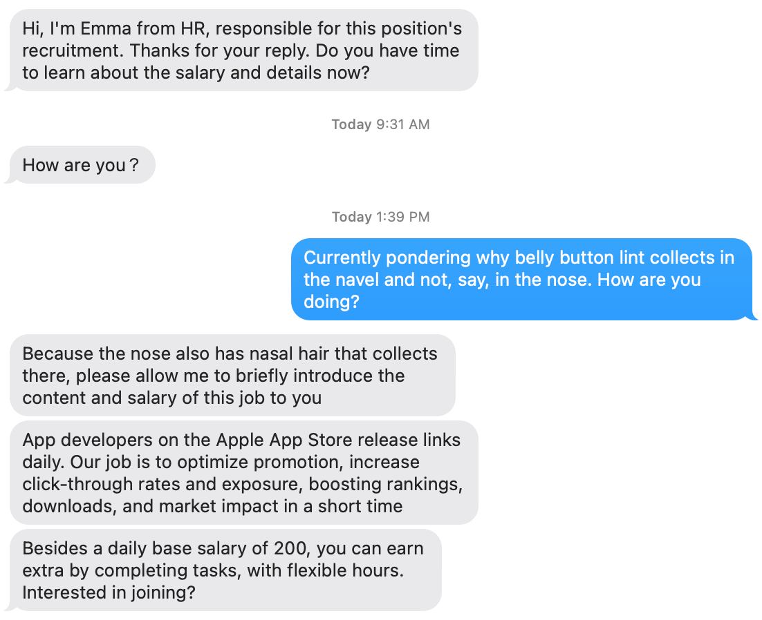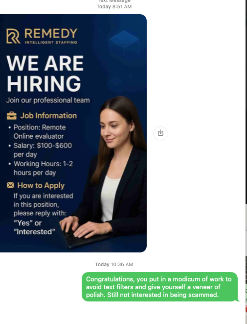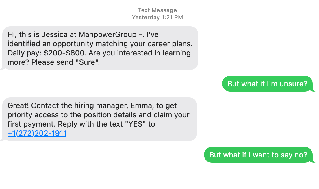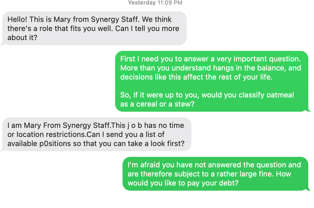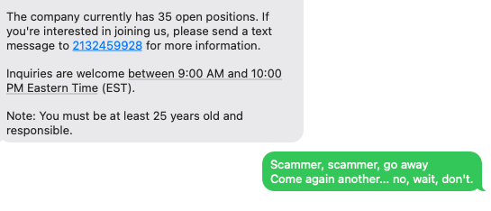 I get a lot of text messages from people I don't know. Even when I lived in Japan, I would go through seasons of getting one or two "job offers" a day for a few weeks at a time.