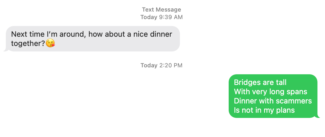 I was getting increasingly irritated by these text messages. There's a strong feeling of helplessness when all you can do is hit BLOCK, especially when you know that there's another ten thousand scammers who already have your number, and even these jerks probably can keep your number and cycle THEIRS out to something different.